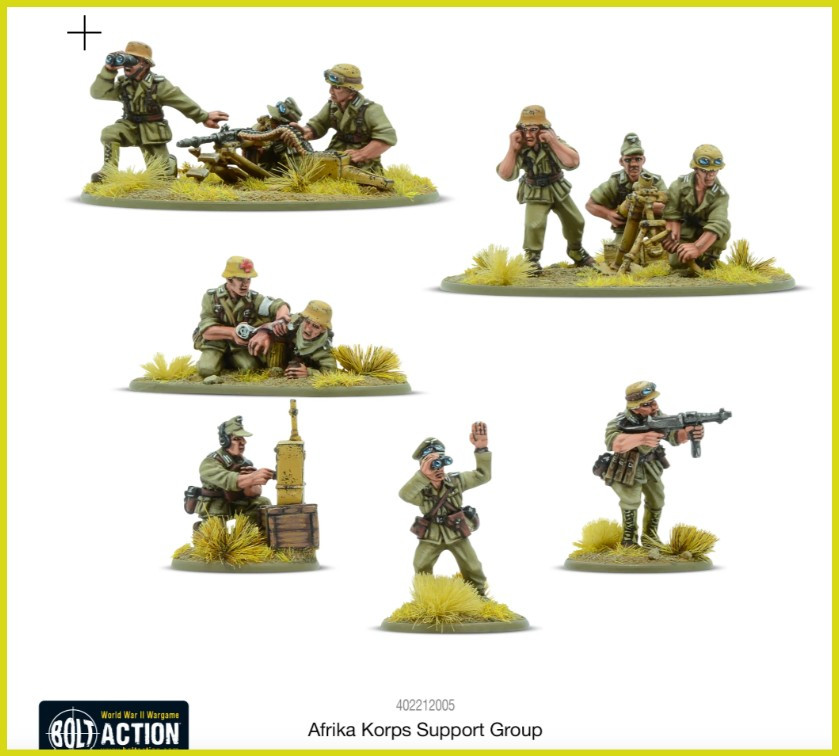 Forged in the early years of WWII, the German Army had a battle-hardened core of officers, NCOs and soldiers. This Afrika Korps Support Group boxed set contains a selection of ubiquitous Headquarters Units and Weapons Teams to supplement your Bolt Action Army.
